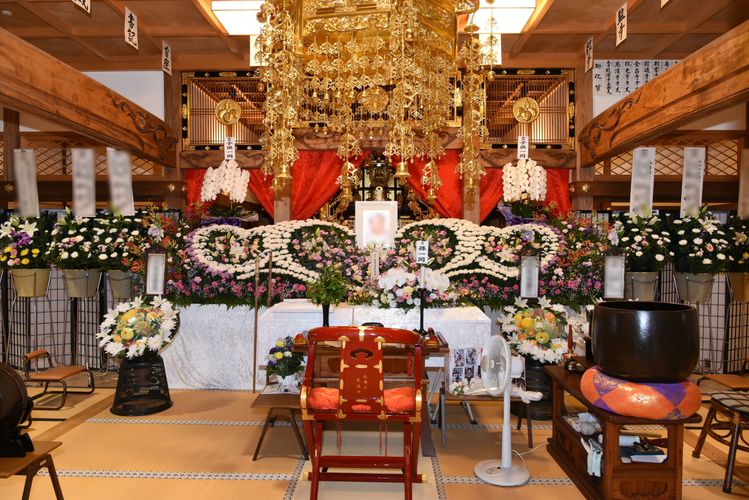 なお、下記写真の施工事例には霊柩車・棺・供花(篭花)等の料金を含んでおります。
